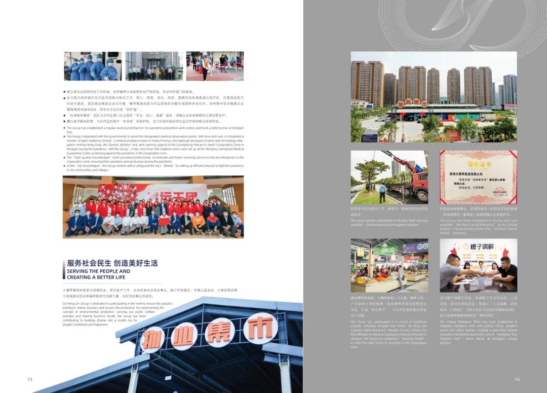積極參與云南怒江、西藏林芝、貴州遵義、廣東陽江茂名等地的幫扶工作,助力推進(jìn)鄉(xiāng)村全面振興;在疫情防控的特殊時(shí)期,舉全集團(tuán)之力支持珠海和合作區(qū)打好疫情防控阻擊戰(zhàn);主動(dòng)投身社會(huì)民生事業(yè),開展公益活動(dòng),為珠海建設(shè)民生幸福樣板城市貢獻(xiàn)力量……