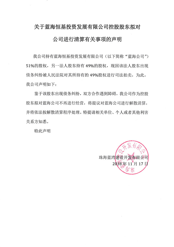 關(guān)于藍(lán)海恒基投資發(fā)展有限公司控股股東擬對公司進(jìn)行清算有關(guān)事項的聲明